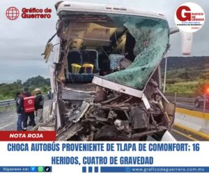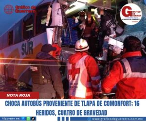 Chilpancingo. Gro., 05 de octubre de 2025.- madrugada de este domingo, un autobús de la línea Sur, proveniente de las ciudad de Tlapa de Comonfort, en el estado de Guerrero, con destino a la Ciudad de México, se impactó por alcance contra un tráiler, dejando un saldo de 16 personas heridas, de las cuales cuatro se reportan graves.