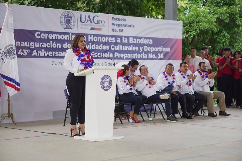 Zumpango del Río Gro., 07 de octubre de 2025. La mañana del día de ayer, la presidenta municipal de Eduardo Neri, Q.B.P. Sara Salinas Bravo, participó en la ceremonia de honores a la bandera e inauguración de actividades culturales y deportivas con motivo del 43° Aniversario de la fundación de la Escuela Preparatoria No 36 UAGro, en Zumpango del Río.