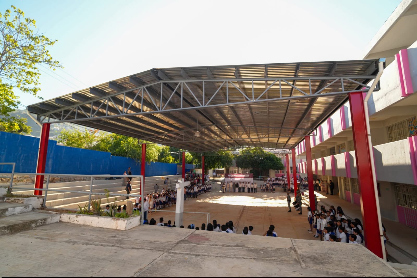 Acapulco, Gro., 12 de enero de 2026. Con la nueva techumbre entregada por la presidenta municipal, Abelina López Rodríguez, los estudiantes de la Escuela Primaria María Orozco de Marrón cuentan ahora con un espacio renovado para sus actividades recreativas, académicas y deportivas.